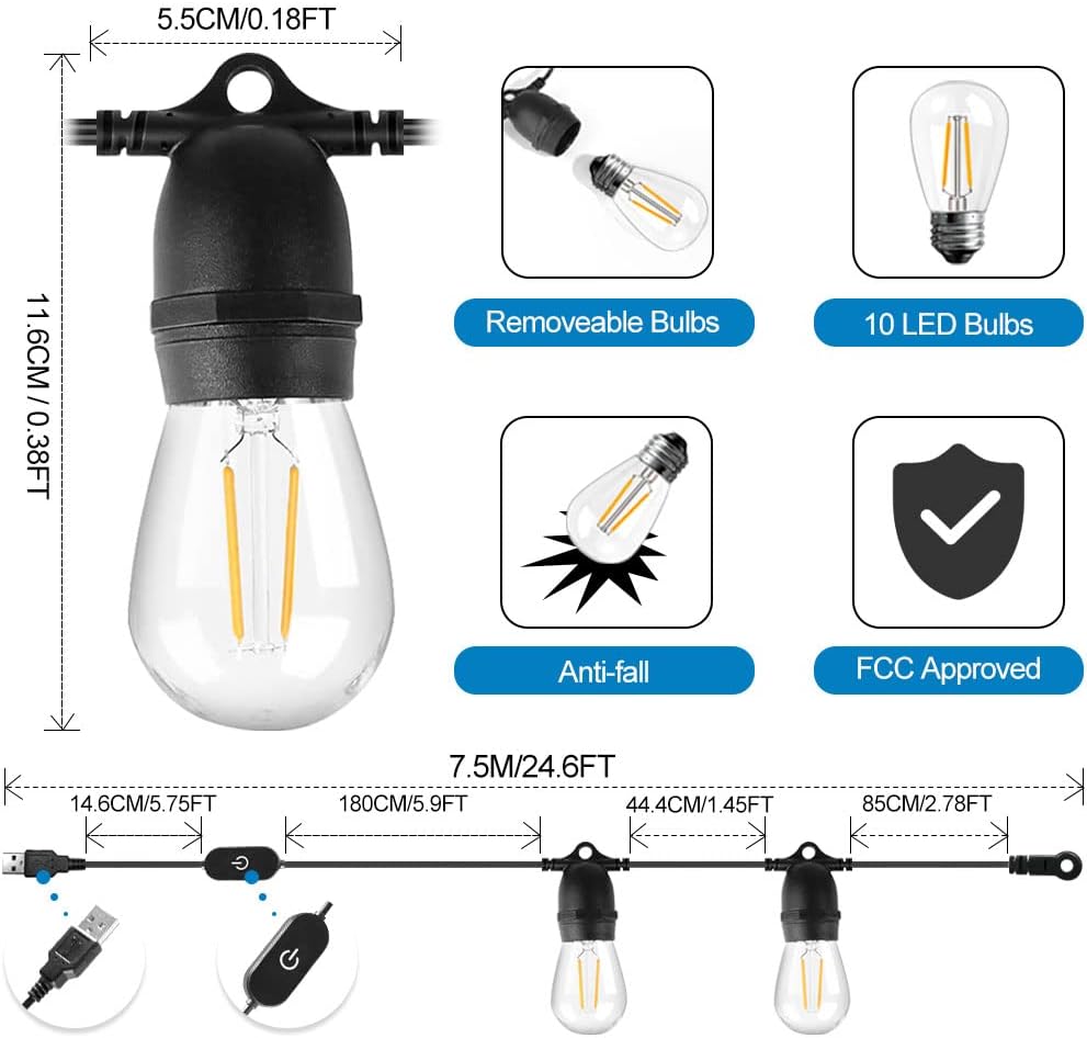 LangPlus+ 24.6FT USB Powered Outdoor String Lights with 10pcs Waterproof Shatterproof S14 LED Bulbs Warm White 2700K Lightweight Dimmable Garden Festoon String Lights for Camping BBQ Christmas Party